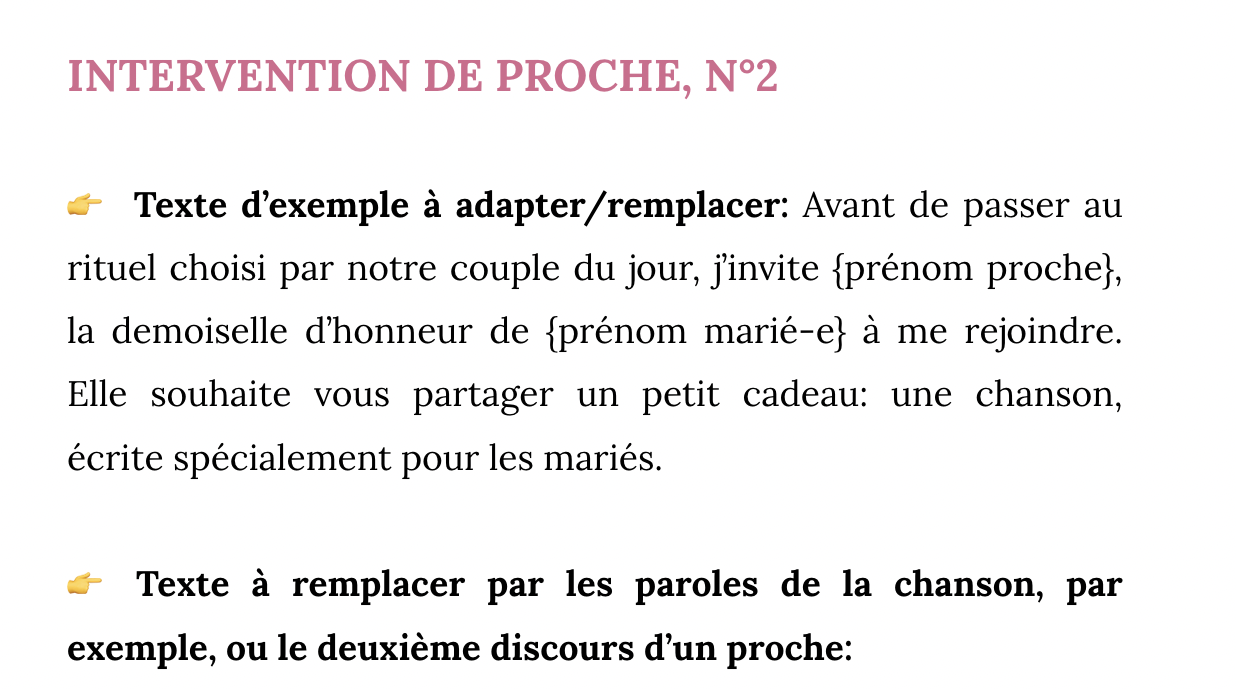 Nous vous conseillons d'intégrer de manière claire les différents moments composant votre cérémonie de mariage. Les mots de bienvenue, les différents discours, l'instant rituel, etc. Tout devrait être indiqué en termes de chapitres, si possible.
