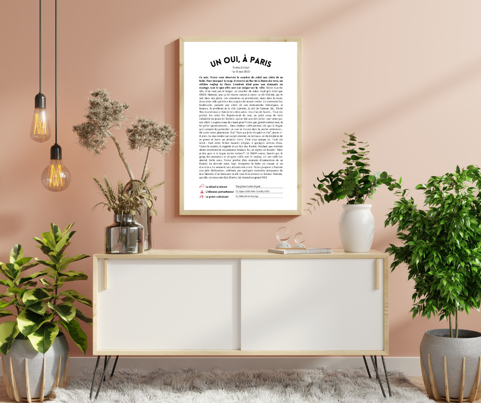 🖼️ Commander le Bout d'histoire, remplir le questionnaire et offrir le produit final (imprimé et encadré, si souhaité), le jour de votre anniversaire de couple, par exemple.